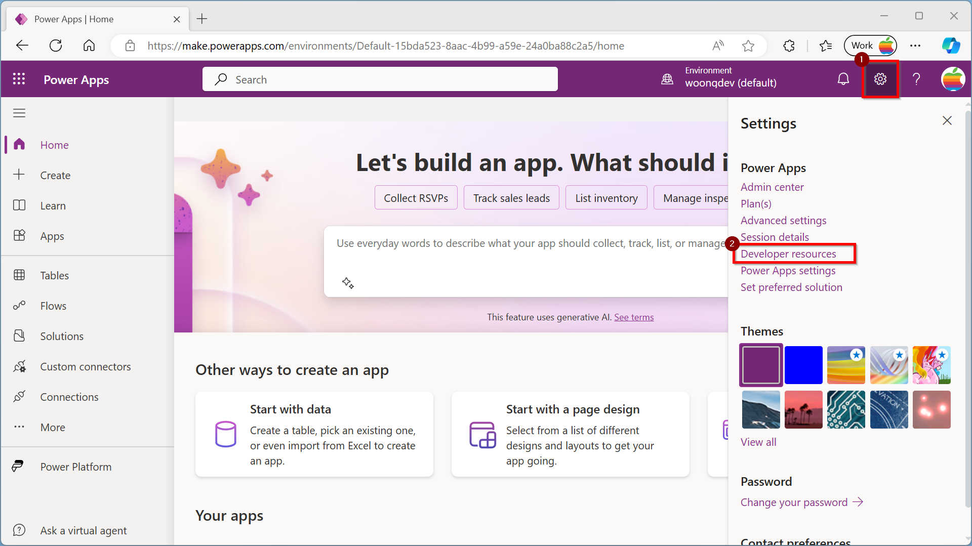 1. In the top right corner “Settings” icon to pull up the right hand pane. Select “Developer resources”