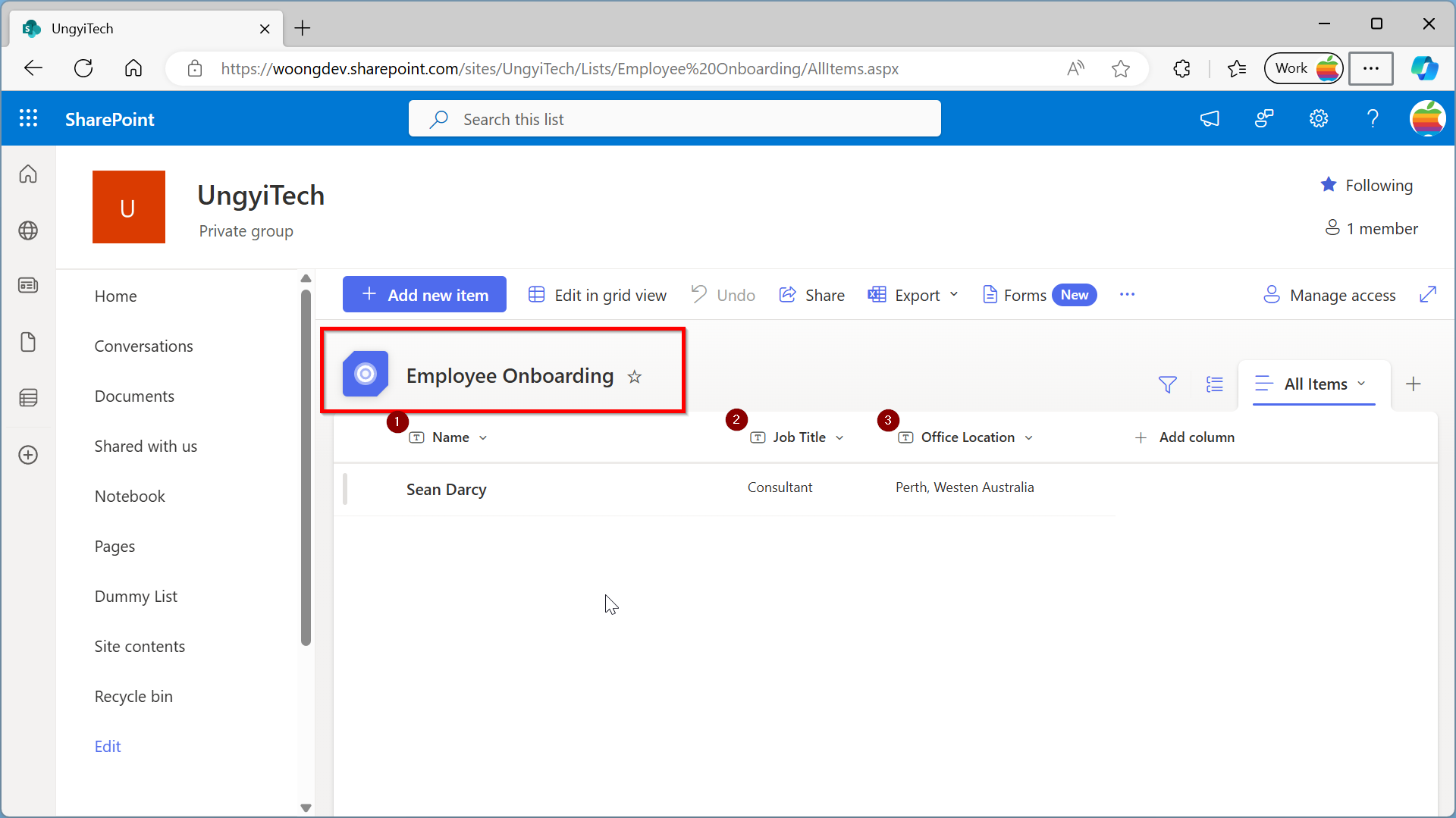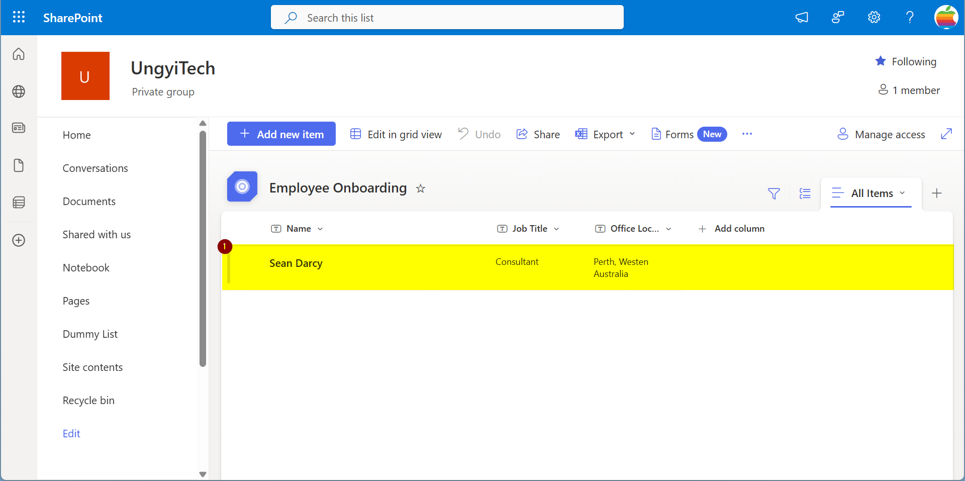 1.1 A new record is created in the Employee Onboarding SharePoint List.