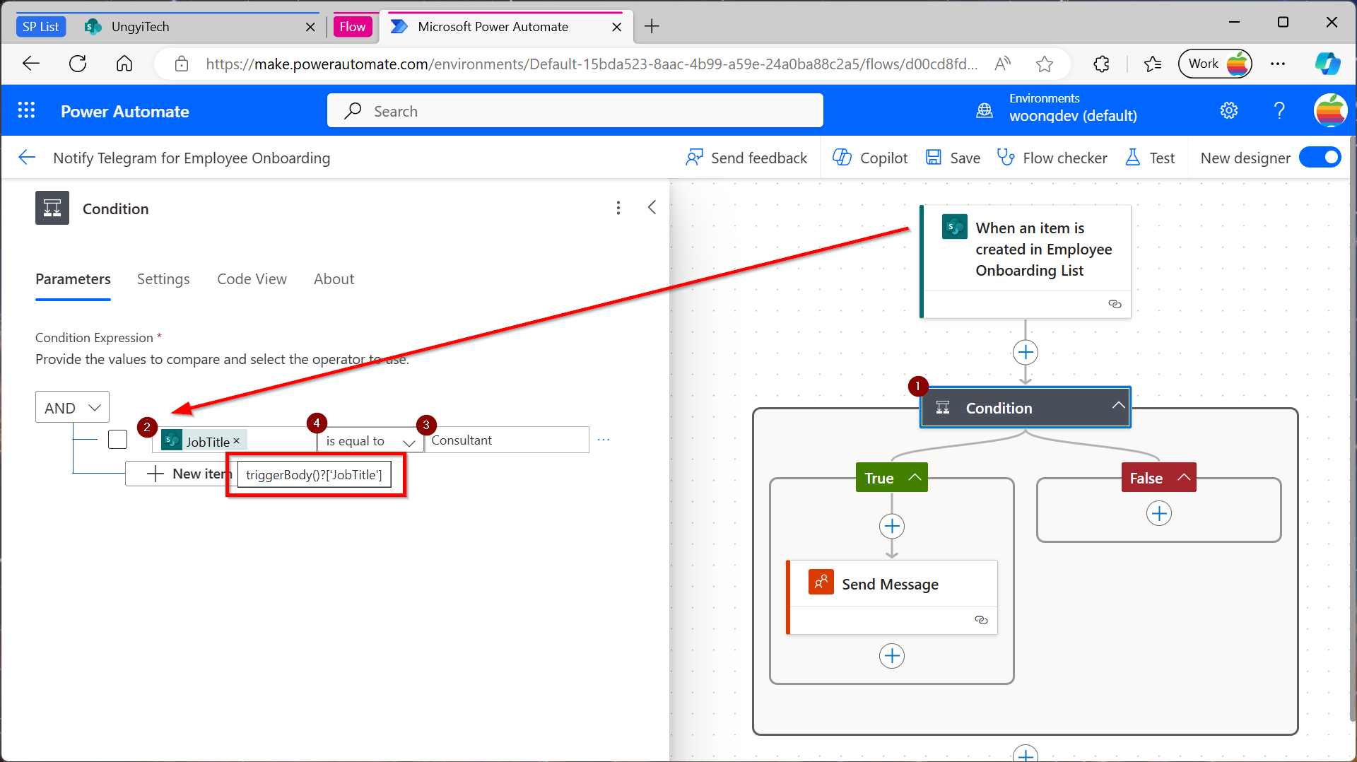 2.3 Add condition. Check if JobTitle is equal to Consultant. Only when the new employee is Consultant, will it notify via Telegram.